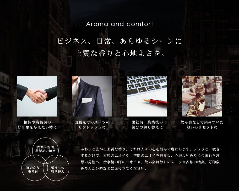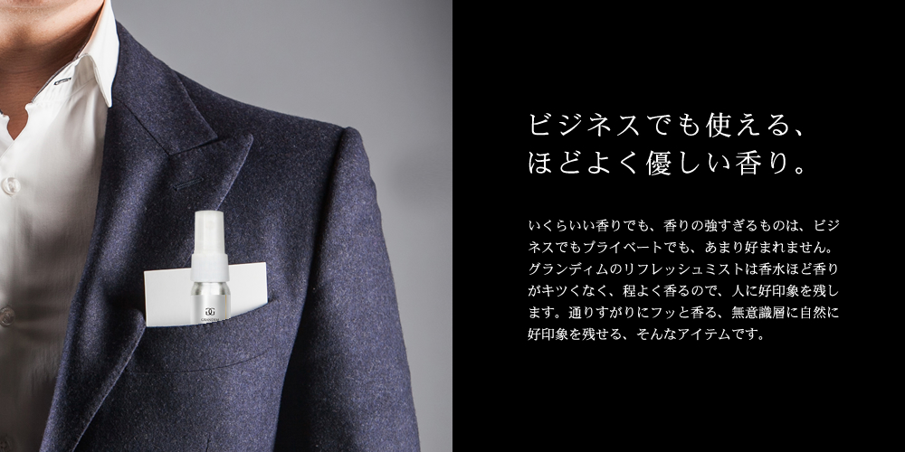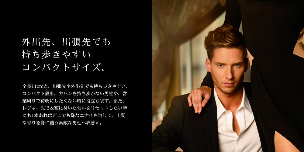上質×機能性を求めたリフレッシュミスト。 出張先でのスーツや、 ジーパンの消臭と、ほのかな香り付けに。 衣類に染みついた汗やタバコの香りをいつでもどこでもリセットし、 心地よい香りで気分までリフレッシュする、 天然アロマ成分入りのリフレッシュミスト。 一拭きするだけで、天然のアロマの癒し効果とともに嫌なニオイを消して、 優しい香りが持続します。